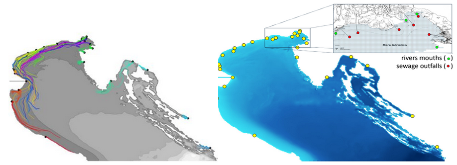 Representation of the first step of the analysis: identification of the main sources of microplastic in the domain of the North Adriatic Sea and construction of their trajectories.